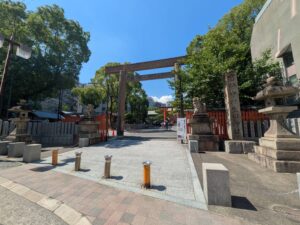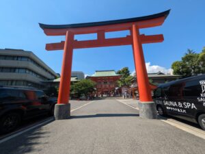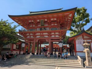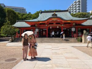 甲子園球場を後に車で30分位(約18Km)で最後の宿泊地である神戸のホテルに向かいました。チェックインの時間にはまだ早かったのでホテルに荷物を預け間隣にある「生田(いくた)神社」に参拝に行きました。正面の「楼門」は二階造りの上部に屋根を持つ門で、鮮やかな朱色に目が惹かれます。女優の藤原紀香さんと、お笑いタレントの陣内智則さんが結婚式を挙げた神社で、1800年以上の歴史を持ち安産祈願・恋愛成就などのご利益で知られ毎年多くのカップルが訪れるそうです。恋愛運を占うおみくじで、「水みくじ」はよく当たると評判で境内の北側にある「生田の森」の中にある「金龍泉」へと持っていき水に浸すと結果が浮かび上がります。娘の結果はまあ~まあ~だった様子です✌。